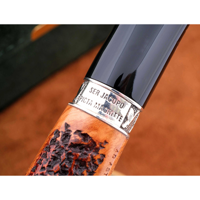 Трубка Ser Jacopo из коллекционной серии, посвященной творчеству бельгийского художника-сюрреалиста Рене Магритта. Магритт был заядлым курильщиком и изображал трубки в некоторых своих работах. Эти трубки были материализованы в бриаре основателем Ser Jacopo Джанкарло Гуиди в серии «Picta Magritte». Серебряное кольцо на чубуке выполнено из серебра 925 пробы. На чубуке снизу и по бокам выбит девиз мастерской PER ASPERA AD ASTRA («Через тернии к звездам», лат.), маркировки: Ser Jacopo, Hand made in Italy, градация R1 C, серия «Picta Magritte N10». Фильтр 9 мм. Вес 67 грамм. Длина трубки 16 см. Диаметр чашки 41 мм. Высота чашки 58 мм. Диаметр табачной камеры 20 мм., глубина 48 мм. В комплекте итальянская подарочная шкатулка, кисет для трубки и буклет «Picta Magritte» с картинами художника и трубками Ser Jacopo. Ручная работа.